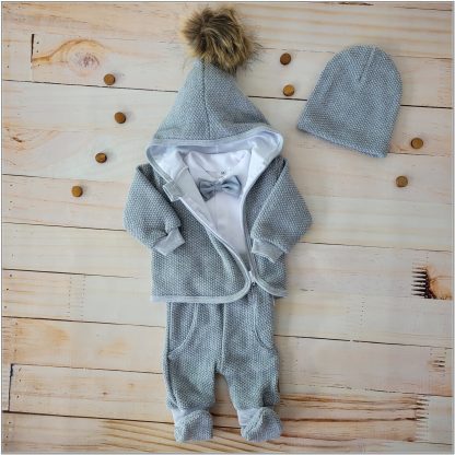 Bunda, čiapka a nohavice so zabudovanými čižmami vyrobené z krásneho úpletu.